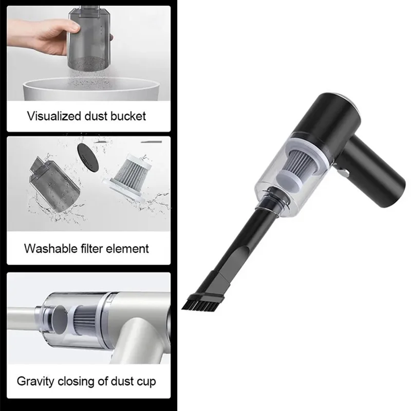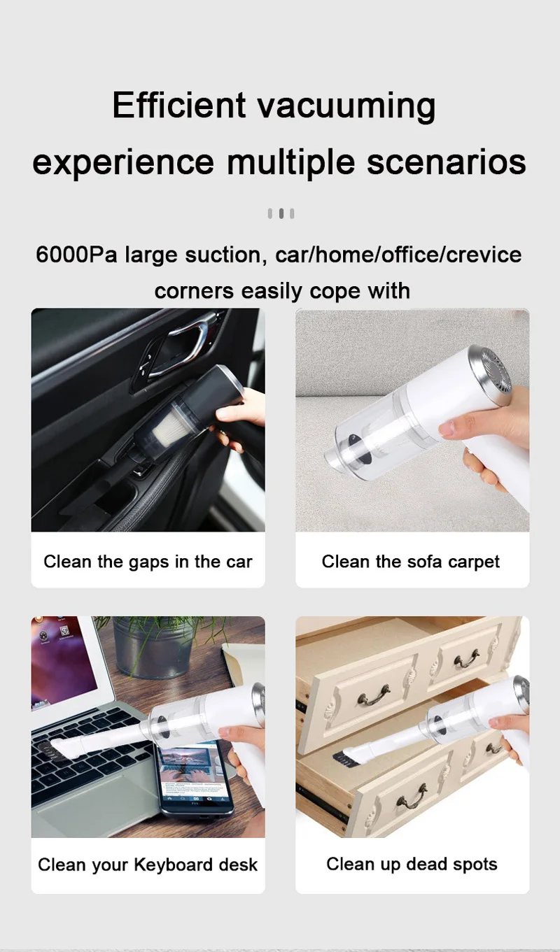 3. Flexible and Cordless Operation: Our wireless vacuum cleaner is small and portable, saving space and offering easy operation. It is suitable for various cleaning scenarios, such as cars, homes, and offices, providing an effective and convenient solution for all your dust cleaning needs.